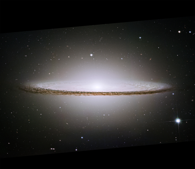 Sombero Galaxy (28 million light years away): This image was taken with the Hubble Space Telescope. In this image we see the dust on the outer part of the disk of stars and the glowing bulge above and below are stars as well. Galaxies such as this one contain 100 billion stars or more. many with a super massive black hole in the center. Light, both visible and infrared provide the evidence for our knowledge of the heavens. More on the Spitzer Space Telescope Site